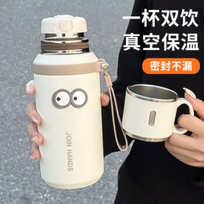 Muting insulated cup for women, high aesthetic water cup for students, male, large capacity 316 stainless steel portable tea making cup with lid, white 600ml, and large eye 3D sticker