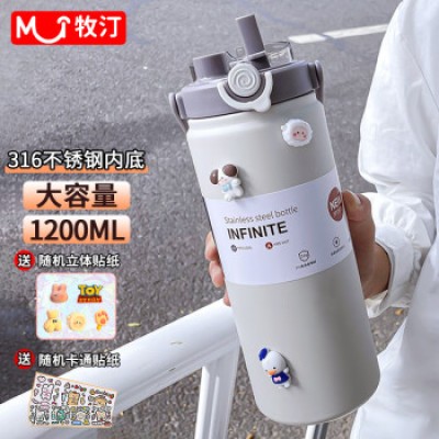 Muting Double Drink Large Capacity Insulated Cup 316 Stainless Steel Men's and Women's High Appearance with Straw Water Cup Pot White -1200ml (with cartoon sticker and 3D sticker)